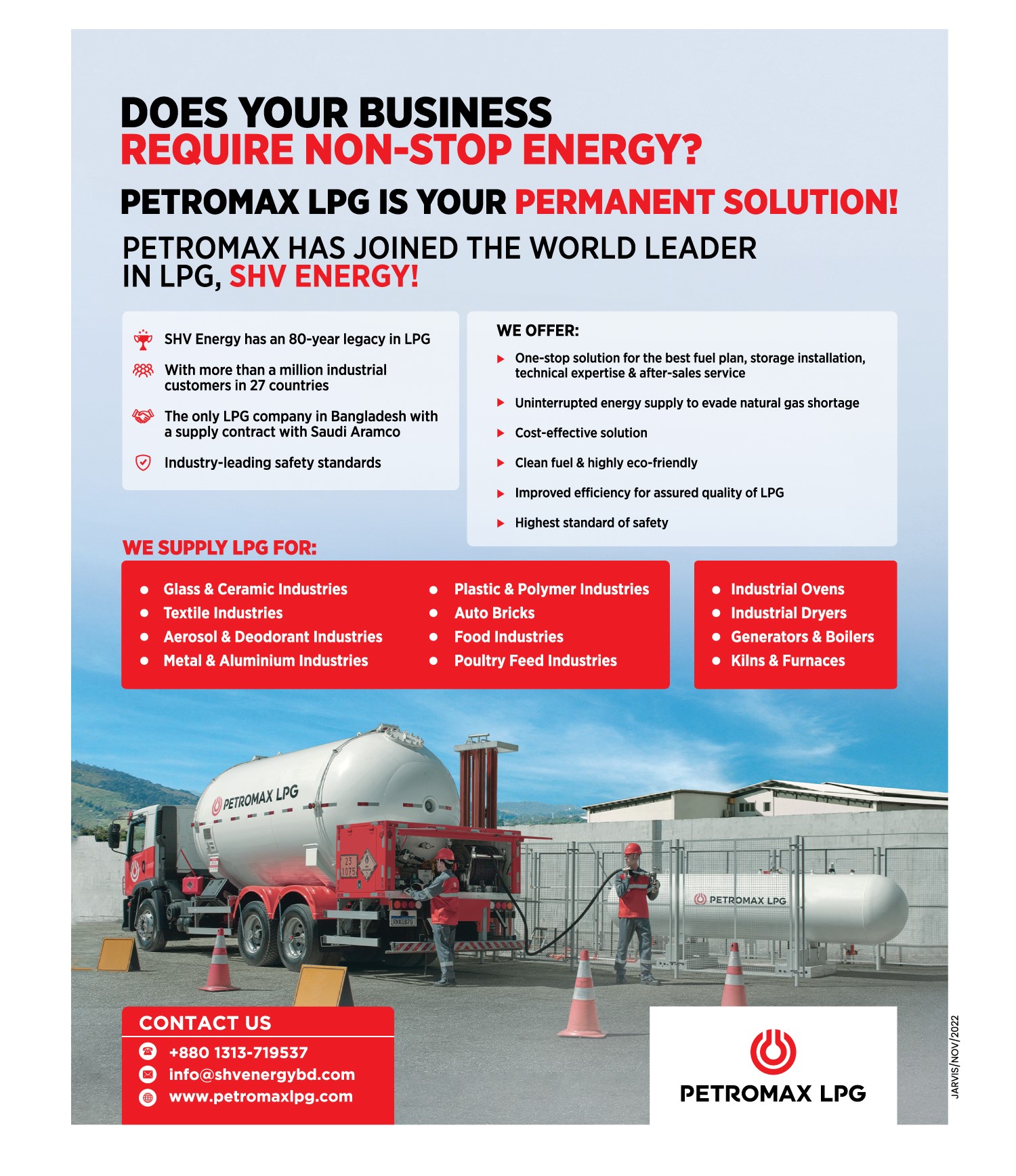 Petromax LPG is a trusted name in clean energy in Bangladesh, providing safe, reliable, and efficient Liquified Petroleum Gas (LPG) solutions for homes, businesses, and industries. From kitchens to commercial enterprises, we supply the energy that powers everyday life. As part of SHV Energy - the global leader in LPG distribution - Petromax LPG benefits from world-class expertise and innovation. With operations in 25 countries and over 30 million customers worldwide, we are proud to bring global standards in energy solutions to households and businesses across Bangladesh.